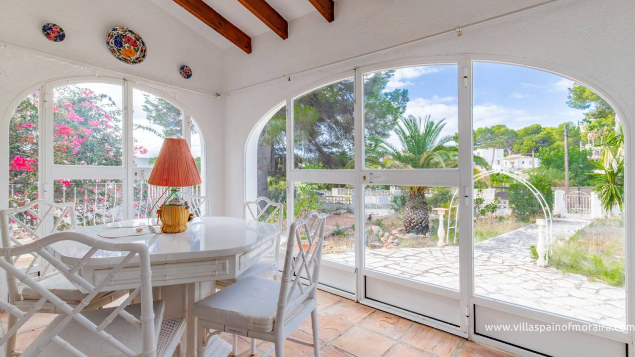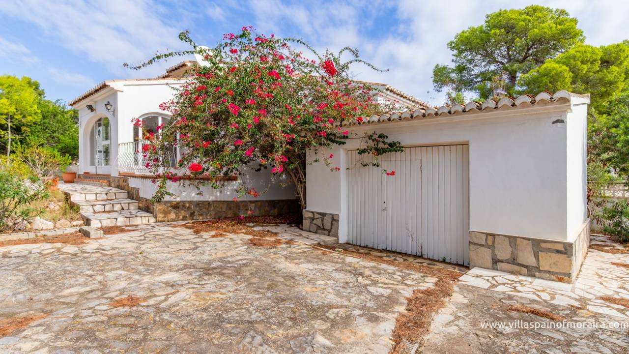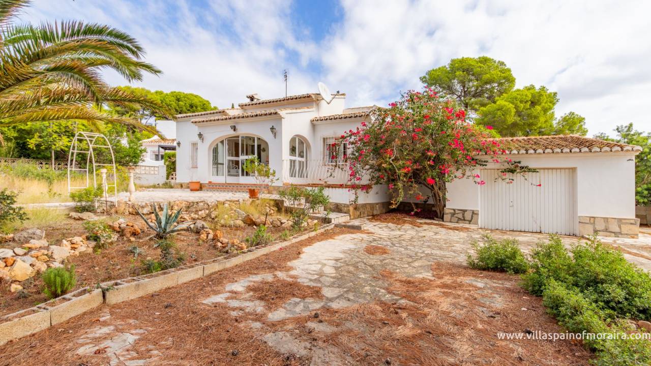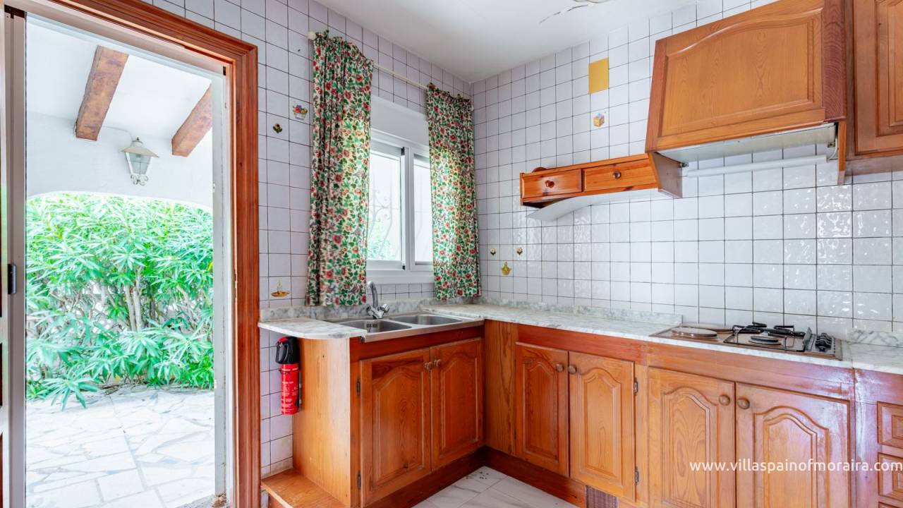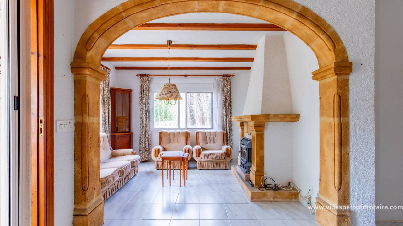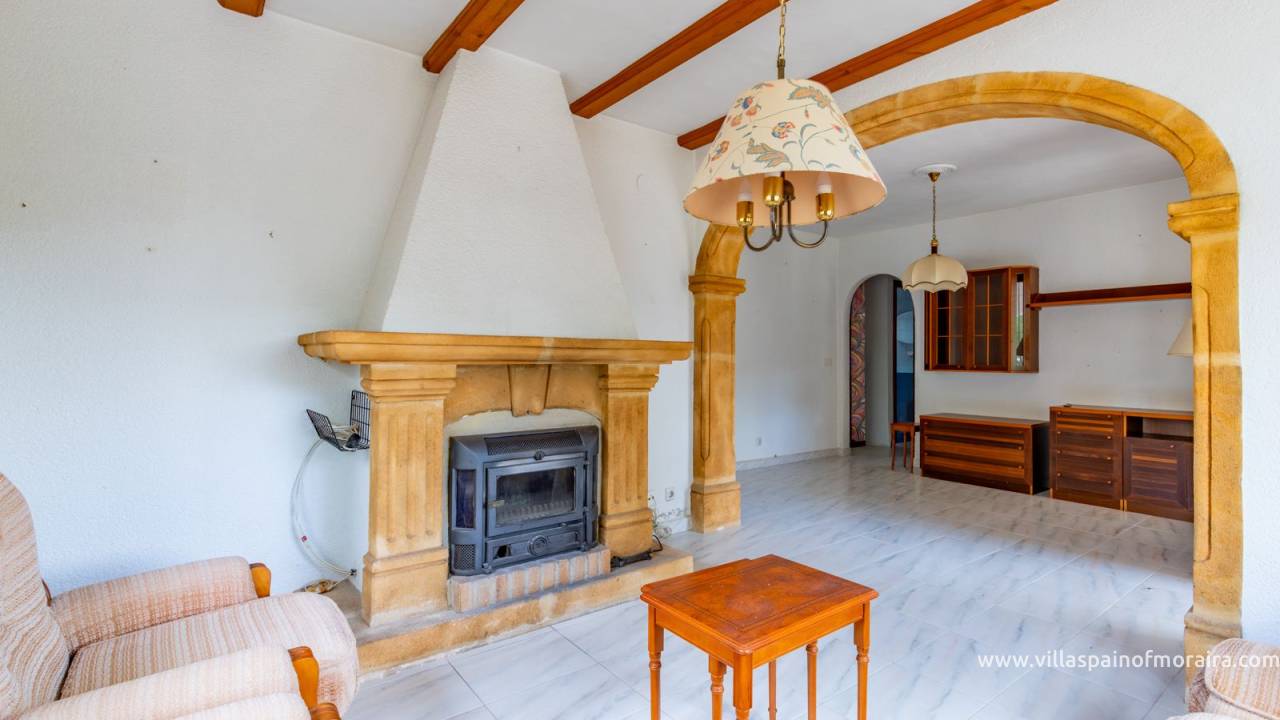 Located close to Moraira town, this villa for sale is situated in the Moravit area just a short walk to shops, restaurants and services. The property is distributed as two bedrooms, two bathrooms, a living and dining room with a fireplace, an independent kitchen, a terrace, and a small covered and glazed naya. Outside, there is a private garden, currently without a pool but with space to build one, a garage, and additional parking space. The property benefits from central heating.