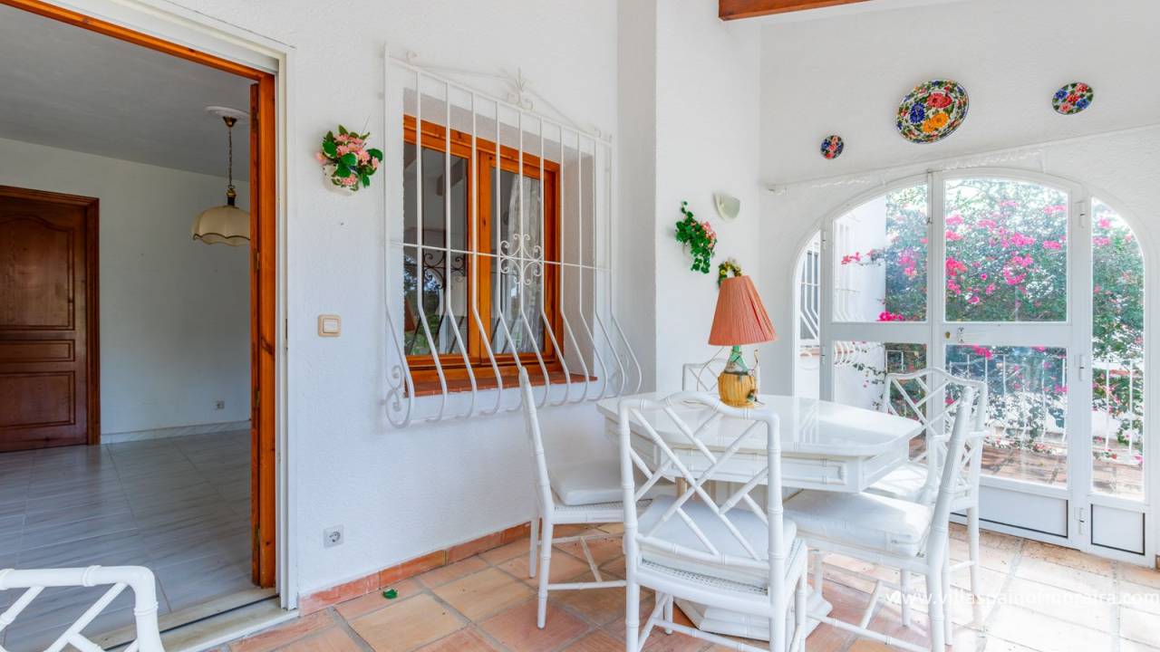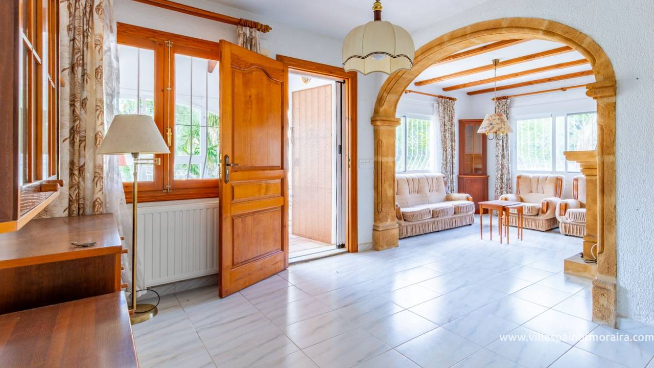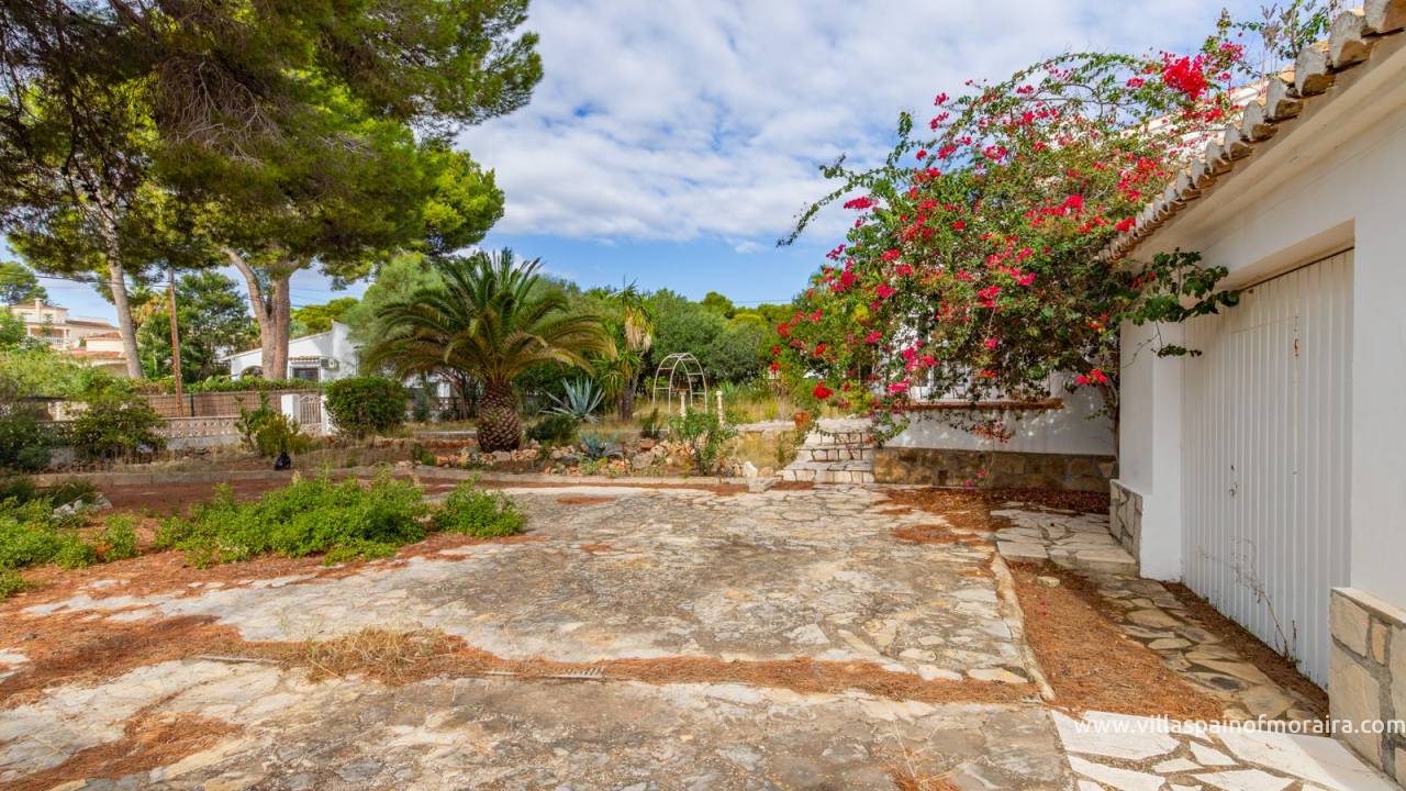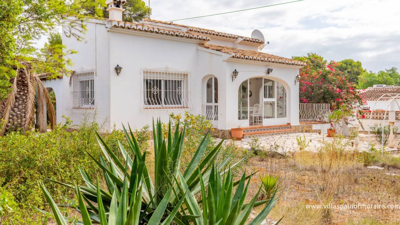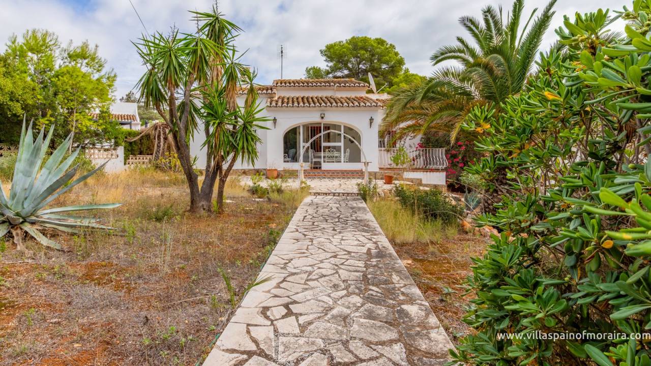 Located close to Moraira town, this villa for sale is situated in the Moravit area just a short walk to shops, restaurants and services. The property is distributed as two bedrooms, two bathrooms, a living and dining room with a fireplace, an independent kitchen, a terrace, and a small covered and glazed naya. Outside, there is a private garden, currently without a pool but with space to build one, a garage, and additional parking space. The property benefits from central heating.