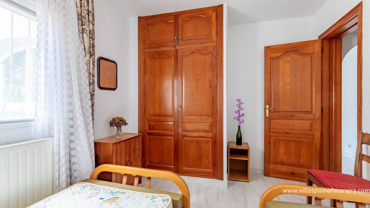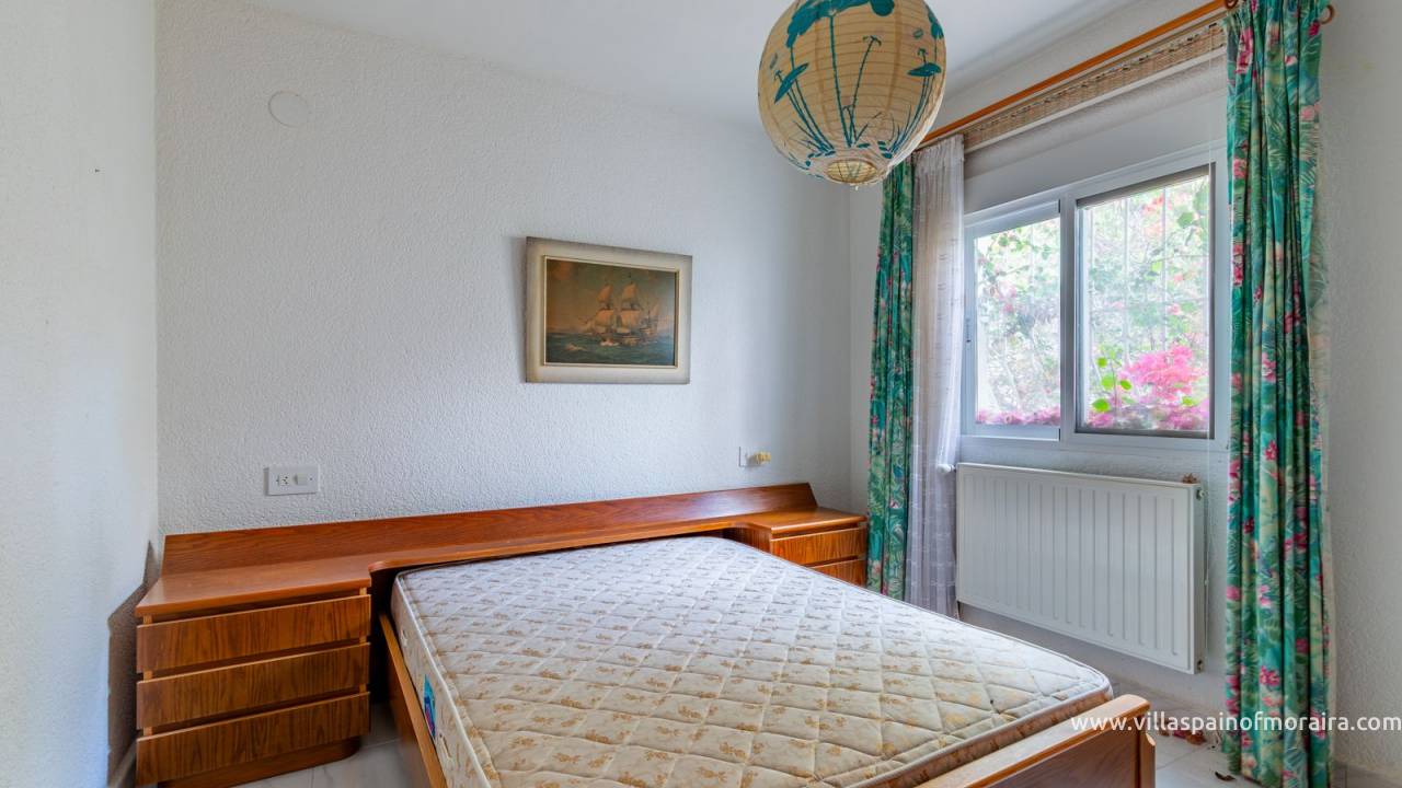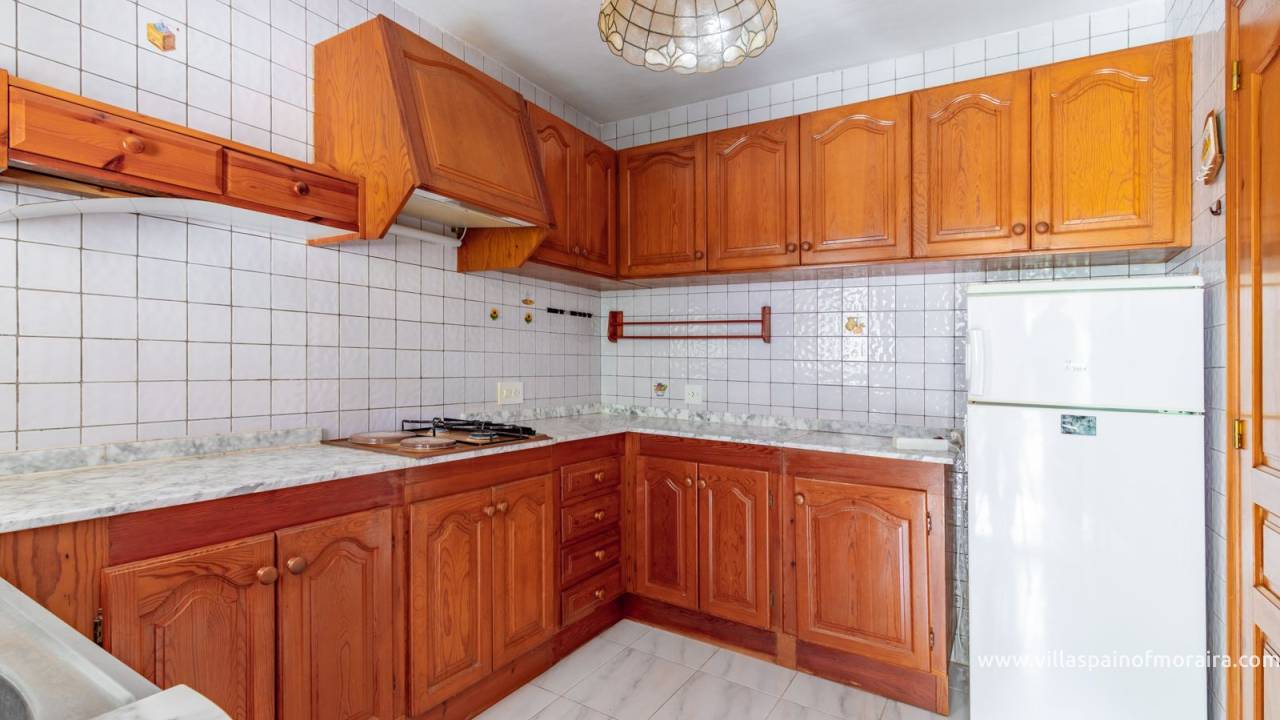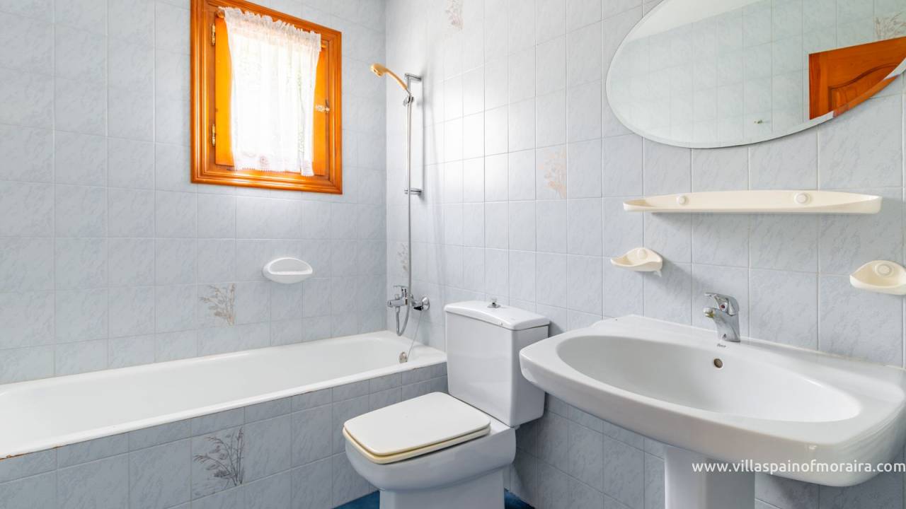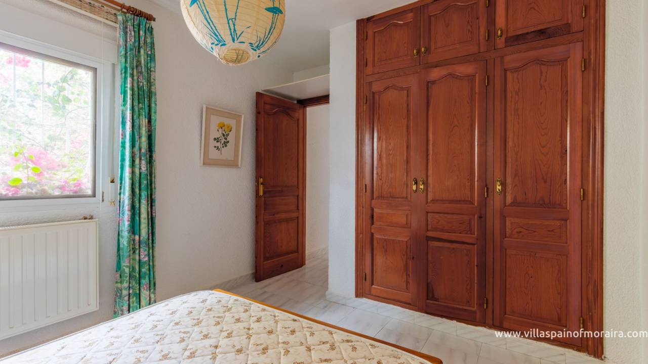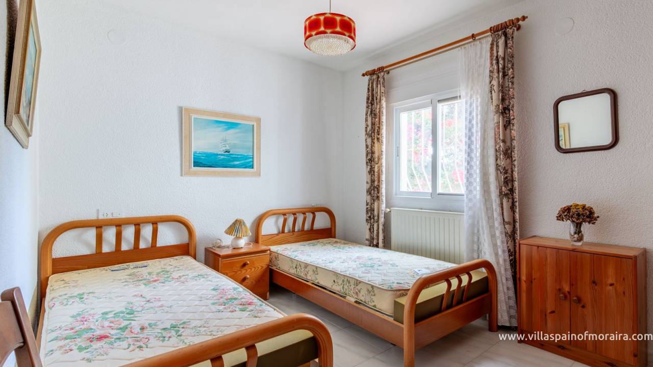 Located close to Moraira town, this villa for sale is situated in the Moravit area just a short walk to shops, restaurants and services. The property is distributed as two bedrooms, two bathrooms, a living and dining room with a fireplace, an independent kitchen, a terrace, and a small covered and glazed naya. Outside, there is a private garden, currently without a pool but with space to build one, a garage, and additional parking space. The property benefits from central heating.