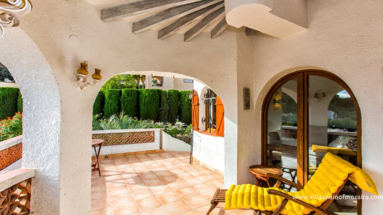 The villa is spread over two floors. On the upper floor, the living room opens directly onto a spacious porch that leads onto a sunny terrace. Inside is a cosy living room with a fireplace and beamed ceiling. The dining room and open plan kitchen are in an adjoining room. There are also two bedrooms with fitted wardrobes and a renovated bathroom with shower.