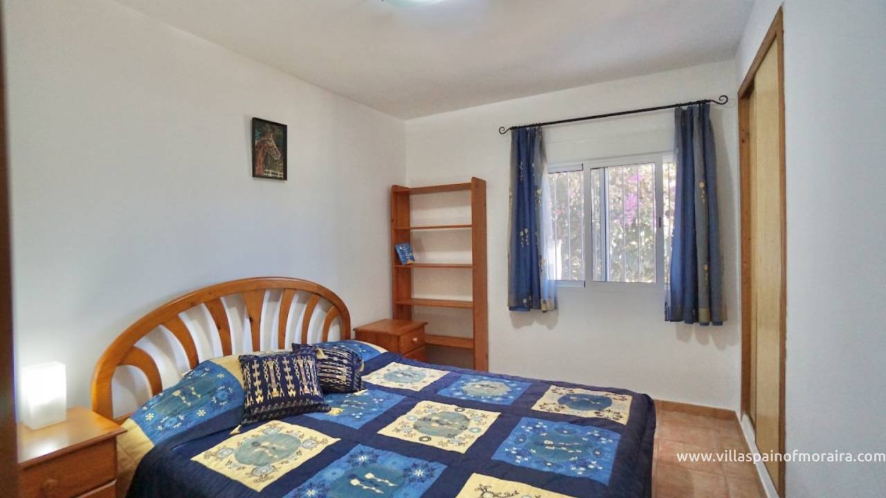 From the living area, a staircase leads to the lower level, where you will find two bedrooms. One bedroom has doors with direct access to the communal terrace, and nearby communal swimming pool. The second bedroom is fitted with a built-in wardrobe.